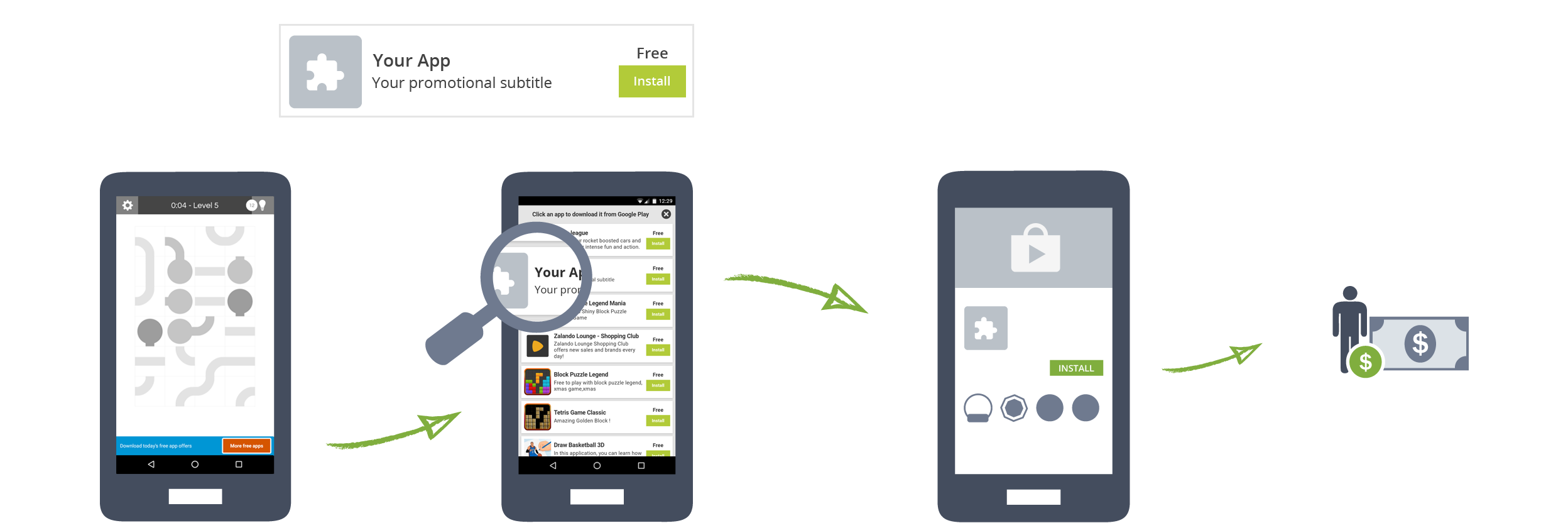 We advertise your Android app or game on banners and app walls. We promote all apps and games on Google Play; this means that as a result of your Android app promotion campaign, the download number on Google Play increases. This may, in turn, lead to more organic app installs. The creative assets for your campaign are automatically generated from your app's Google Play icon and the title and subtitle you want to use.