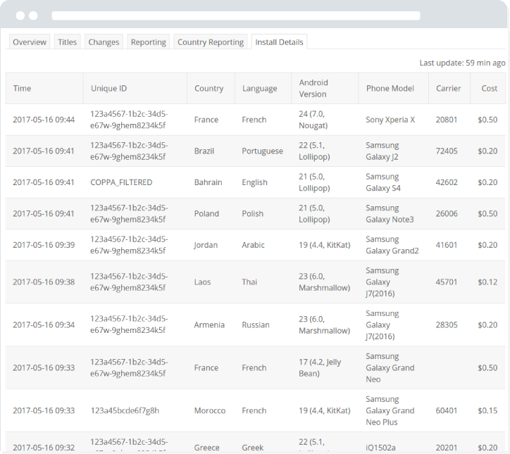 This overview shows all individual installs for your campaign with data like country, phone model and cost.